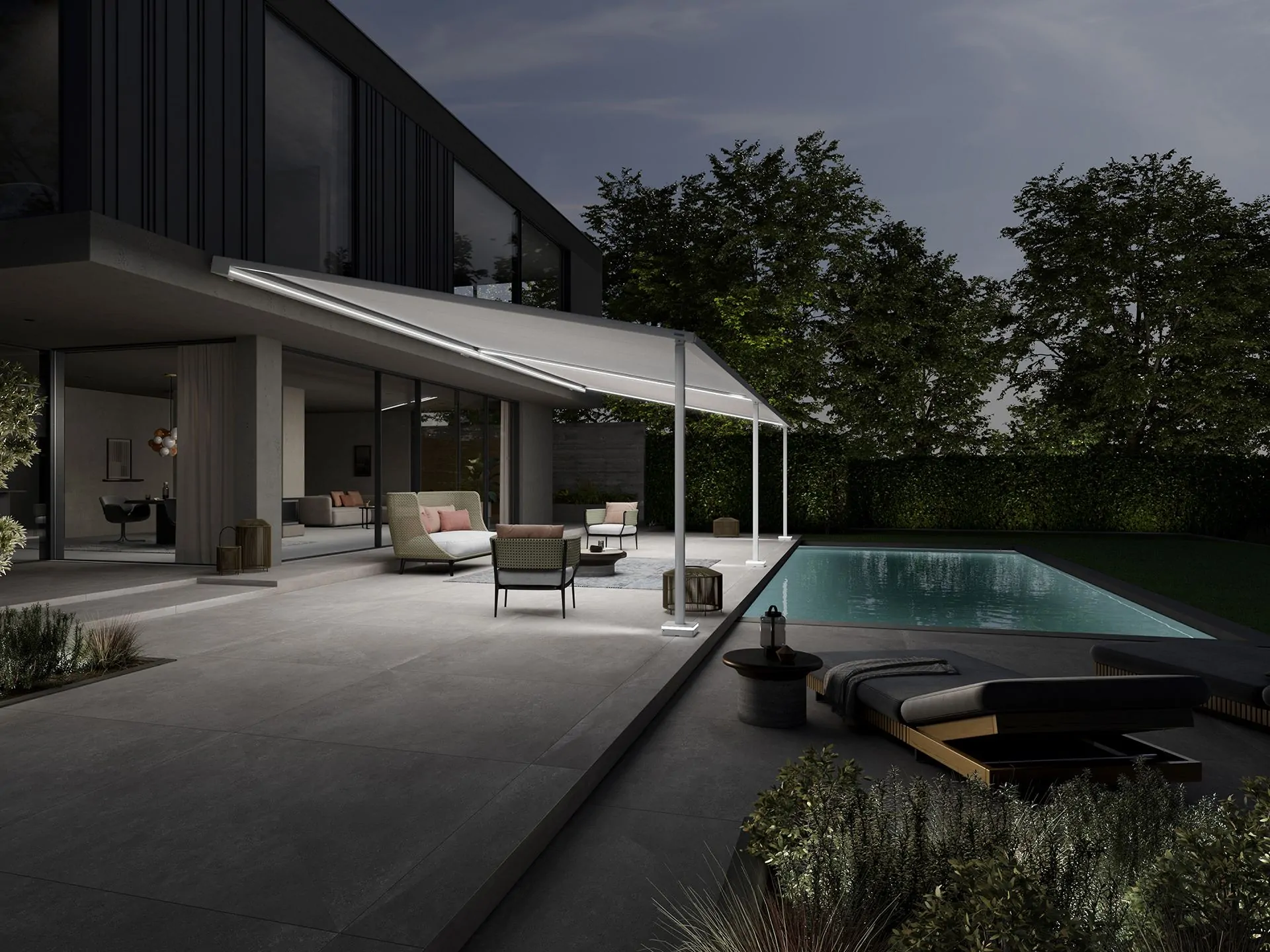 The Markilux Pergola Style is a modern and elegant pergola awning designed for those who appreciate clean lines and sophisticated simplicity. This solar protection system stands out with its resolutely angular design, offering significant convenience and the ability to transform your patio area. With optional integrated smart LED lighting, controllable via an app, it brings both form and function to your outdoor living space.