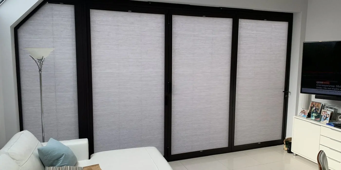 Duette blinds are a fantastic solution for bifold doors primarily as they can recess into the frame against the glass on most modern doors and are designed to “move with the door” when folding your bifold sections.