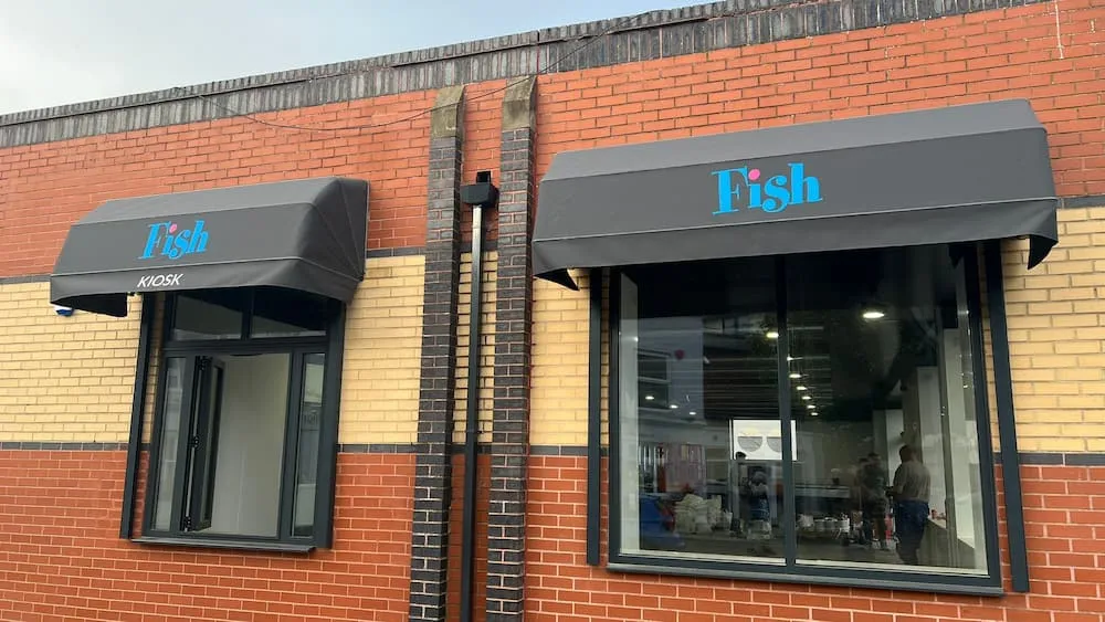 The reason was to meet the brief, we could cover the shutter boxes and span the large widths while offering our signwriting service, we could decorate the canopies giving a great focal point and directing potential customers where they could easily purchase fresh fish from the kiosk.